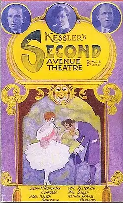 Di Goldene Kale (The Golden Bride) is a 1923 comic operetta, written in the style of Gilbert and Sullivan and Viennese Operetta with elements of klezmer, Jewish cantorial music, Eastern European folk music, ragtime and jazz. Di Goldene Kale was the hit show of 1923, running for 18 weeks at Kessler's 2nd Avenue Theater, a 2,000 seat house in the heart of the “Jewish Broadway.” This run was followed by national and international tours and had several revivals through the 1930s and 1940s.