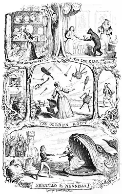 Center-wise: Parmetella opens the box and the instruments fly out of it. Illustration by George Cruikshank for The Story of Stories (1850).