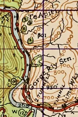 The regions on either end of the Manawatū Gorge were farming regions, including dairy. In 1915 the Palmerston North branch of the New Zealand Farmers' Union investigated the possibility of utilising limestone deposits located in the hill above The Gorge station.[6][7] However, it would be another two decades before the plant was finally built by the Manawatu Gorge Lime Company.[8] To serve this traffic, in 1937 a new loop was installed next to the backshunt, 44 chains (890 m) towards Woodville. Limestone traffic continued for three decades before the rail facilities were reduced in 1962 and closed in about 1966.[5]