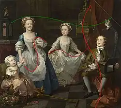 The Graham Children is a conversation piece,[3] an informal group portrait of family or friends, often engaged in conversation or some other kind of activity,[4] though the painting is larger than a typical work of that type. From left to right in the picture are Thomas, born 1740 and dressed in skirts as was typical for small boys until they were breeched, Henrietta, Anna Maria and Richard.[note 1]