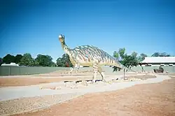 Mutt, the replica Muttaburrasaurus, occupying the site of the former Grand Hotel, in 2025