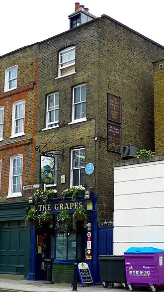 The Grapes is a public house situated directly on the north bank of the Thames in London's Limehouse area, with a veranda overlooking the water. To its landward side, the pub is found at number 76 in Narrow Street, flanked by former warehouses now converted to residential and other uses. It is listed Grade II on the National Heritage List for England.[1]