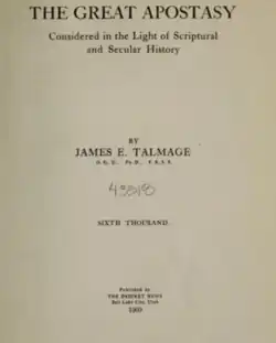 3. ^ Richard E. Bennett; Amber J. Seidel (2005). "'A World in Darkness': Early Latter-day Saint Understanding of the Apostasy". Window of Faith: Latter-day Saint Perspectives on World History. Religious Studies Center, Brigham Young University. Retrieved 2016-05-24. Perhaps still the best known doctrinal study of the Latter-day Saint position of the apostasy is that by James E. Talmage, The Great Apostasy—Considered in the Light of Scriptural and Secular History (Salt Lake City: Deseret Book Company, 1909).