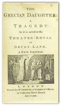 The Grecian Daughter is a 1772 tragedy by the Irish writer Arthur Murphy.[2] It was widely performed for nearly sixty years, through the 1830s.[3] For many British actresses in the eighteenth century, playing the role of the central heroine, Euphrasia, was an important part of gaining fame.[3]