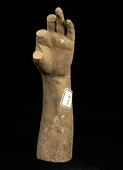 Master carvers then used the durable plaster cast as a measuring tool, covering the surface of the plaster cast with hundreds of pencil marks and metal pins, or points, which served as registration marks for a pointing machine. The pointing machine was moved repeatedly from the points on the plaster cast to corresponding areas on a block of marble to guide the carver's tools as he translated the composition into marble.[28] The tool would then be moved, over and over again, hundreds of times, from the points on the plaster to the corresponding locations on the block of marble. Each time, the tool would measure the depth and location on the marble block, creating a three-dimensional guide that helped the marble carver replicate the artist's original form more quickly and with greater ease.[30] When creating the finished marble versions, fine details such as the cross, locket, and chains were finalised, and differ slightly among the marble versions. The Smithsonian American Art Museum holds the original 1843 pointed-plaster mold, along with numerous smaller casts from Powers' studio.[3]