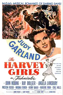 The Harvey Girls is a 1946 Technicolor American musical film produced by Arthur Freed for Metro-Goldwyn-Mayer. It is based on the 1942 novel of the same name by Samuel Hopkins Adams, about Fred Harvey's Harvey House waitresses.[2] Directed by George Sidney, the film stars Judy Garland and features John Hodiak, Ray Bolger, and Angela Lansbury, as well as Preston Foster, Virginia O'Brien, Kenny Baker, Marjorie Main and Chill Wills. Future star Cyd Charisse appears in her first speaking role on film.