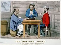 "The Heathen Chinee", originally published as "Plain Language from Truthful James", is a narrative poem by American writer Bret Harte. It was published for the first time in September 1870 in the Overland Monthly.[1][2] It was written as a parody of Algernon Charles Swinburne's Atalanta in Calydon (1865),[1] and satirized anti-Chinese sentiment in northern California.