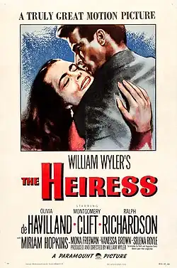 The Heiress is a 1949 American romantic drama film directed and produced by William Wyler, from a screenplay written by Ruth and Augustus Goetz, adapted from their 1947 stage play of the same title, which was itself adapted from Henry James' 1880 novel Washington Square. The film stars Olivia de Havilland as Catherine Sloper, a naive young woman who falls in love with a handsome young man despite the objections of her emotionally abusive father who suspects the man of being a fortune hunter. Montgomery Clift stars as Morris Townsend, and Ralph Richardson as Dr. Sloper.[3][4]