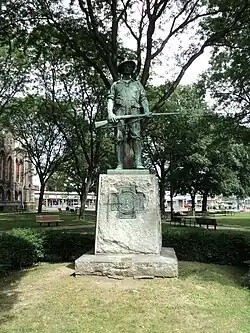 1938 Traffic island at the intersection of Plymouth Avenue and Pleasant Street Fall River Massachusetts 41°41′55″N 71°08′48″W / 41.698609°N 71.146773°W / 41.698609; -71.146773 (Fall River, Massachusetts) The base upon which statue stands is formed from the top of a column from the demolished Fall River Customs House and Post Office set on a slab of Fall River granite. In 1983, the local and state historical commissions nominated the statue for the National Register of Historic Places, but the listing was rejected.[14] [15]