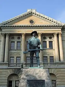 The original statue was unveiled at the University of Minnesota on Memorial Day, 1906.[4] The statue stands in front of the armory at 15 Church Street. Also known as the Student Soldier Memorial, it is a monument to the 218 University of Minnesota students who served in the Spanish–American War.[5] The statue is 9 feet (2.7 m) tall and stands on a 6-foot (1.8 m) granite base, depicting a soldier clad in a period uniform with a campaign hat and a Krag–Jørgensen rifle. Today this statue, now missing the muzzle of the rifle,[6] is popularly known as Iron Mike.[5]