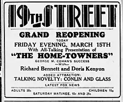 The Home Towners is a 1928 American comedy film directed by Bryan Foy and starring Richard Bennett, Doris Kenyon, and Robert McWade.[1] This film was the third all talking picture produced by Warner Brothers to be released.