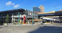 The Hop, also known as the Milwaukee Streetcar, is a modern streetcar system in Milwaukee, Wisconsin. The system's 2.1-mile (3.4 km)[5][3][6] original "M" line connects the Milwaukee Intermodal Station and Downtown to the Lower East Side and Historic Third Ward neighborhoods.[7] On April 11, 2024, a 0.4-mile (640 m) Lakefront, or "L" line,[5] to the nearly complete high-rise development The Couture, began offering full daily service. Additional extensions for new lines are currently in the planning stage. The system is owned by the city and operated by Transdev.