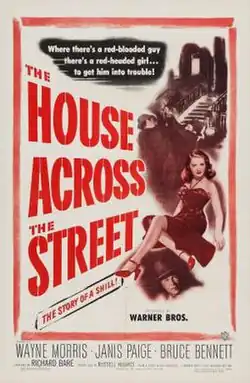 The House Across the Street is a 1949 American comedy film directed by Richard L. Bare and written by Russell S. Hughes.[2] The film stars Wayne Morris, Janis Paige, Bruce Bennett, Alan Hale, Sr., James Mitchell and Barbara Bates. The film was released by Warner Bros. on September 10, 1949.[3][4] The story on which the screenplay was based, written by Roy Chanslor, was originally made as the movie Hi Nellie in 1936.[5] The source material had also been reworked in Love Is on the Air (1937) and You Can't Escape Forever (1942).