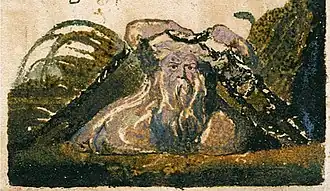 The illustration shows a gowned old man with a long beard who kneels with his legs outspread. He raises his arms to grip the ropes as if he tries to free himself. There is a tree trunk with a broad base on the right and the edge of another on the left. The colour of the sky suggests sunrise or sunset. A muddy river runs along the lower edge of the design in front of the man. The picture portrays the supreme God of Blake's mythology and the creator of the material world, whom Blake named "Urizen" (probably from your reason), struggling with his own nets of religion, under the Tree of Mystery, which symbolically "represents the resulting growth of religion and the priesthood (the Catterpillar and the Fly), feeding on its leaves".[6]