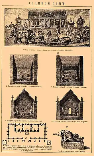 The Ice House (Russian: Ледяной дом) was an palace built of ice in the winter of 1739–40 in Saint Petersburg, Russia. The palace and the surrounding festivities were part of the celebration of Russia's victory over the Ottoman Empire. The Empress Anna Ivanovna ordered Alexis Tatishchev, a court functionary, to construct it on the river Neva between the Admiralty and the Winter Palace during the bitterly cold winter of 1739–40. It was 80 feet long, 33 feet high, and 23 feet deep, and cost 30,000 rubles. By June 1740, the palace had melted into mere blocks of ice floating in the river.[1]