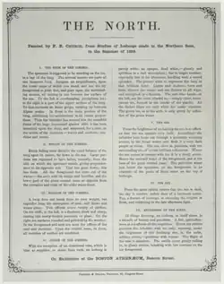 A broadside was prepared to orient exhibition visitors to the painting. It described the scene in largely objective terms. Given its lack of figurative language, it may have been written by Church himself—Louis LeGrand Noble, by contrast, used much rhetorical flourish in his booklet for The Heart of the Andes.[13] The broadside begins by orienting the viewer to the scene as a whole: