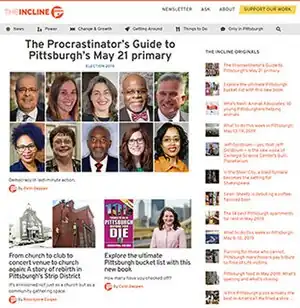 Spirited Media founded Philadelphia's web-only local news site Billy Penn in 2014. Billy Penn functions as a mixture of links to news articles produced by other outlets with its original reporting mixed in.[6] Rather than direct ad sales, Billy Penn found success with an event-based business model. Spirited Media looked for new cities to deploy it in.[7] In 2016, Pittsburgh was identified as the second city after major investments came from Gannett.[8] The Incline deviated from Billy Penn, by selling ads upon its introduction in order to gain exposure and awareness.[2]
