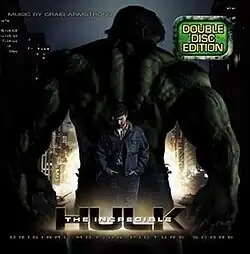 Craig Armstrong was the arranger for Massive Attack, a band director Louis Leterrier was fond of and had collaborated with on the 2005 film Unleashed. Armstrong was his first choice, which surprised Marvel, not knowing if he had scored an action film (he did compose 2001's Kiss of the Dragon).[1] Even the temp track consisted of Armstrong's work and similar music by others. The Hulk, alongside the Green Lantern, was one of Armstrong's favorite comics characters as a child, although he did not watch Ang Lee's Hulk.[2] Armstrong began composing in his home in Glasgow, Scotland with three sequences; the Hulk and Betty in the cave; the Abomination and the Hulk's alley fight; and Bruce and Betty's reunion. The majority was composed in a few weeks in Los Angeles, California, which proved to be very intense for director and composer. The score was recorded over four days during late 2007 in a chapel in Bastyr University, located in Kenmore, Washington. Pete Lockett played ethnic instruments in the score, which were recorded in London and mixed together with the orchestra and electronics.[2] The score was orchestrated by Matt Dunkley, Tony Blondal, Stephen Coleman, David Butterworth, and Kaz Boyle.[3] Leterrier suggested the score be released on two discs, which Armstrong believed to be a joke. Only when he compiled the album – and Marvel asked why they were only given one disc – did he realize they were serious.[2]