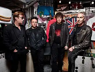 Each member first came to the public's attention as a member of another band (Clem Burke in Blondie, Glen Matlock in the Sex Pistols, James Stevenson in Chelsea, Generation X and Gene Loves Jezebel, Gary Twinn in Supernaut and Twenty Flight Rockers).[1][2] During their career, the four musicians became well known to each other, all of them had already worked together in different capacities, but never all in the same group at the same time.[3] In 2011, Australian promoter Bicci Henderson suggested Gary formed a new band for a tour there, instead of a reformed Supernaut. Gary contacted James, Clem and Glen, then during rehearsals and the Australian tour they got along well and The International Swingers continued.[2][4][5][6] In 2012 through 2014 the band performed tours in the United States and in 2013 a sold out show in London.[7]