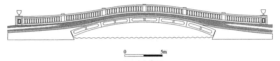 The bridge at Culford follows this design with 5 cast iron voussoirs making up one segment arc, which is repeated six times, forming the 60 ft span connected with socketed joints. Arched plates between the ribs carry the infill up to roadway level with channelled granite abutments on either side. Masonry balustrades line the edge of the bridge, 20 ft wide, with carved marble urns at the ends.[4]