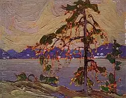 The painting depicts a jack pine as a decorative and abstracted pattern, its shapes boldly simplified against the sunset.[3][6] This stylization demonstrates Thomson's command of decorative effects, developed during his years as a graphic designer,[9] and with the strong colour and value contrasts, creates the picture's symbolic resonance.[3] The pine, its branches bowed and placed to the right of centre, extends nearly the full length of the canvas, and is cropped at the top. It rises from a rocky foreground; the hardy jack pine often takes root on shores hostile to other trees, its sparsely leaved branches forming eccentric shapes.[6] It is silhouetted against water and sky, with the canvas bisected by the far shore.