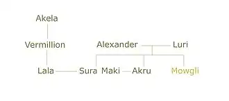 - Luri - Alexander's widow, Mowgli's wolf mother and the biological mother of Akru and Sura. Beige furred. She later becomes the official new leader of the pack and the first female leader of the pack when Akela steps down from his position once again, after originally asking Mowgli to convince Vermillion if he'd accept the request of leading. She came up with the plan of getting an ex-member of the pack named Grizzle exiled from it again, this time along with his gang, without having to battle. She is stern and protective, but also wise and kind, demonstrating great leadership skills.