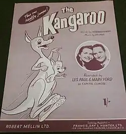 Les Paul built the tune upon a rhythm track originally intended for a cover of "Stompin' at the Savoy." Norman Gimbel[1] later wrote lyrics for the tune, which was published by the Deerhaven Music Corporation, Robert Mellin in the UK and originally by Iris-Trojan Music Corporation in the U.S. Although released as an instrumental, Gimbel and Paul share publishing credit on the record label. "The Kangaroo" was released as a Capitol records 7" vinyl 45 single as F2614, Matrix #45-11879.[2] The single was also released as a Capitol 10" shellac 78 single. The flip side was "Don'cha Hear Them Bells". The single reached no. 25 on the Billboard chart and no. 23 on the Cash Box chart in 1953.