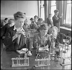 The school opened the day after the start of the Second World War in 1939 as the Baldock County Council School and within a week of opening had welcomed evacuee children from Stratford in London; in 1944 a photographer from the Ministry of Information took a series of pictures of students at the school to show the positive way that a typical country school was adjusting to life during wartime. These images showed students having medical examinations, taking part in sports and domestic science lessons, cooking over open fires and cultivating the school's playing field to grow food.[7]