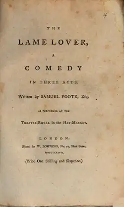The Lame Lover is a 1770 comedy play by the British writer Samuel Foote.[2] Foote wrote the play while he was recovering from the amputation of his leg, following a riding accident.[3]