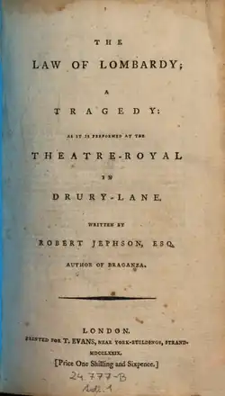 The Law of Lombardy is a 1779 tragedy by the Irish writer Robert Jephson.[2] The original Drury Lane cast included William Smith as Paladore, Robert Bensley as King, John Hayman Packer as Rinaldo, Richard Hurst as Asciano, James Wrighten as Forester, John Henderson as Bireno, Mary Robinson as Alinda and Elizabeth Younge as Princess. It was dedicated by Jephson to George III.