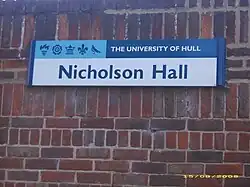 Nicholson Hall was the fifth hall of the Lawns Complex. It takes its name from the principal of Hull University College in 1935, John Nicholson. Nicholson led the campaign to achieve the college's independence, which eventuated on 13 May 1954. Nicholson Hall housed approximately 142 students in both medium and en-suite rooms. This was the only self-catered Hall on the Lawns Complex.[1] Most rooms have washbasins and a balcony. In 2009 Nicholson Hall was re-furbished converting all double rooms to singles, updated kitchen diner kitchens similar to the Downs and Morgan Hall designs with additional en-suite facilities in particular blocks.