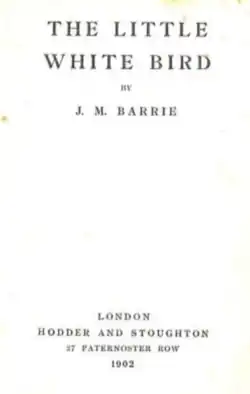 The Little White Bird is a novel by the Scottish writer J. M. Barrie, ranging in tone from fantasy and whimsy to social comedy with dark, aggressive undertones.[3] It was published in November 1902, by Hodder & Stoughton in the UK and Scribner's in the US (and the latter also published it serially in the monthly Scribner's Magazine from August to November).[1] The book attained prominence and longevity thanks to several chapters written in a softer tone than the rest of the book, which introduced the character and mythology of Peter Pan. In 1906, those chapters were published separately as a children's book, Peter Pan in Kensington Gardens.[3]