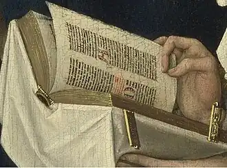 Mary Magdalene as depicted in early Renaissance painting is a composite of various biblical figures. Here, she is based on Mary of Bethany, who is identified as the Magdalene in the Roman Catholic tradition. Mary of Bethany sat at Jesus' feet and "listened to His Word", and thus is seen as a contemplative figure. The counterpoint is Mary's sister Martha who, representative of the active life, wished that Mary would help her serve.[9] Mary is shown by van der Weyden as youthful, sitting in quiet piety with her head tilted and eyes modestly averted from the viewer. She is absorbed in her reading of a holy book, the covers of which include a chemise of white cloth, a common form of protective binding. Four coloured cloth bookmarks are tied to a gold bar near the top of the spine. According to Lorne Campbell, the manuscript "looks rather like a 13th-century French Bible" and is "clearly a devotional text".[10] It was rare for contemporary portraits to show women reading, and if the model herself could read then she was likely from a noble family.[11]