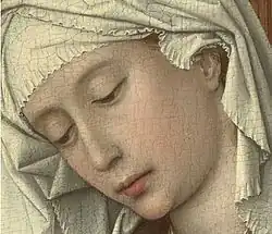 Many of the objects around her are also closely detailed, in particular the wooden floor and nails, the folds of the Magdalene's dress, the costume of the figures in the exterior and the beads of Joseph's rosary.[9][13] The effect of falling light is closely studied; Joseph's crystal rosary beads have bright highlights, while subtle delineations of light and shade can be seen in the sideboard's tracery and in the clasps of her book. Mary is absorbed in her reading and seemingly unaware of her surroundings. Van der Weyden has given her a quiet dignity although he is generally seen as the more emotional of the master Netherlandish painters of the era, in particular when contrasted with Jan van Eyck.[13]
