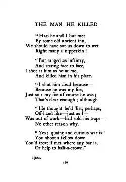 "The Man He Killed" is a poem written by Thomas Hardy. Written in 1902, it was first published in Harper's Weekly, Nov. 8 1902.[1] The first book publication was in his Time's Laughingstocks and Other Verses (London: Macmillan, 1909).[2]