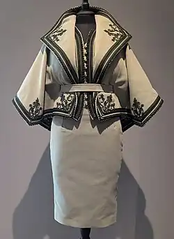 The eveningwear portion comprised 1950s-inspired ball gowns, including a red one with a voluminous mermaid skirt that evoked the designs of Charles James.[14][23][21] The dress which closed the collection was a take on the bejewelled, flesh-toned, and skintight dress worn by actress Marilyn Monroe when she sang "Happy Birthday" to President John F. Kennedy in 1963.[21]