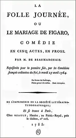The Marriage of Figaro (French: La Folle Journée, ou Le Mariage de Figaro ("The Mad Day, or The Marriage of Figaro")) is a comedy in five acts, written in 1778 by Pierre Beaumarchais. This play is the second in the Figaro trilogy, preceded by The Barber of Seville and followed by The Guilty Mother.[1]