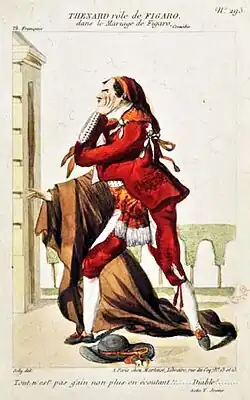 Beaumarchais wrote detailed notes on the characters, printed in the first published text of the play, issued in 1785.[19] The author prescribed that Figaro must be played without any suggestion of caricature; the Count with great dignity yet with grace and affability; the Countess with restrained tenderness; Suzanne as intelligent and lively but without brazen gaiety; Chérubin as a charming young scamp, diffident only in the presence of the Countess.[19] Chérubin is traditionally played as a trouser role by a woman. Beaumarchais said that in the original company, there were no boys available who were both the right age and who could understand all the subtleties of the role: most of the character's comic traits come from the view of an adult looking back on puberty with amusement.[20]