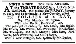 The play was translated into English by Thomas Holcroft,[3] and under the title of The Follies of a Day – Or The Marriage of Figaro it was produced at the Theatre Royal, Covent Garden in London in late 1784 and early 1785.[11] In France the play has held its place in the repertory, and leading companies have played it in the original language to audiences in Europe and America.[12] In 1960 a Comédie Française production was filmed, under the direction of Jean Mayer, with Jean Piat as Figaro.[13]
