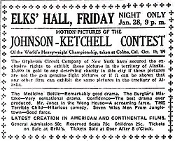 By October 1909, the two split-reel shorts were still being widely distributed and were finally reaching many small-town theaters. A writer that month for the newspaper The Brunswick News in Georgia was highly complimentary of The Medicine Bottle, but, unlike Alfred Greason, he evidently did not even see the film before providing readers with his brief assessment of the production. Possibly confusing the thriller with Jones and His New Neighbors, the reviewer in the October 7 issue of The Brunswick News confidently declares, "'The Medicine Bottle' is another comedy drama full of fun", adding "If this picture does not make you laugh nothing will."[19] Three months later—over 4,100 miles from Brunswick and nearly a year after the release of The Medicine Bottle and its split-reel companion—copies of the shorts finally arrived in the United States territory of Alaska, in the port town of Skagway.[20] There the thriller was advertised on January 27, 1910, issue of The Daily Alaskan as a "Remarkably good drama" and promoted as an upcoming attraction being presented at the local Elks' Hall with the "screaming farce" Jones and His New Neighbors, which the newspaper misidentifies and misspells in its advertisement as "Mr. Jones in the W[r]ong House".[20] Five additional motion pictures were promoted as well on the same bill, with the main feature being footage of the heavyweight championship fight between boxers Jack Johnson and Stanley Ketchel, a bout that had occurred three months earlier in Colma, California before a crowd of 10,000 spectators.[21]