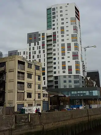 The Mill consists of 215 apartments, offices, shops and restaurants.[2] There is a paved courtyard in the centre of the development which provides access from College Street to the waterfront. The main tower's exterior was completed in 2009, but the interior was left unfinished.