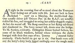 - "At eight in the morning four of us stood about the Transport Yard feeling out of sorts with life. Just our luck to have clicked '[shit]-cart on a Monday, the double-load day."[7]