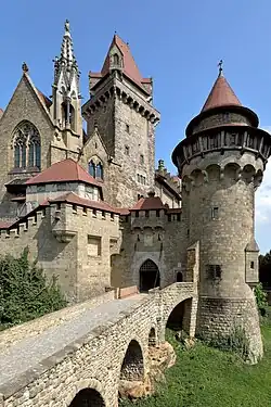 For some external shots of the cathedral, the ground was covered with cotton wool to simulate snow, at a cost of 5,000 crowns. Filming continued in the recently completed (1874–1906) mock-mediaeval Burg Kreuzenstein, also near Vienna,[39] Menchen having received permission from the owner, Count Wilczek.[3]