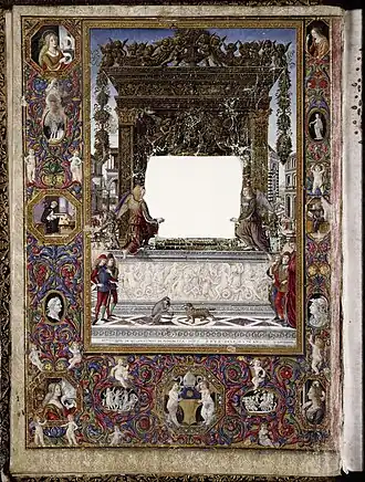 The frontispiece (fo 6 vo, reproduced at the top of the page) contains a decoration covering the entire page and is used to frame the incipit of the missal text written in gold capital letters. The small central frame containing the text was cut out at an unknown date and remains empty today. The text was inscribed in a large carved altarpiece placed on an altar. The front of this altar is decorated with a bas-relief depicting the Triumph of Neptune and Amphitrite, inspired by the decoration on an Ancient Roman sarcophagi, now in the Villa Medici.[2][13]