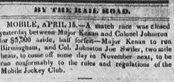 As early as 1836 Major Kenan's "Birmingham" raced Col. Johnston's "Joe Swiler" for $5,000.[1]