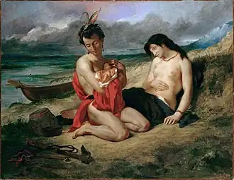 The Natchez is an oil-on-canvas painting executed ca. 1834–35 by the French Romantic artist Eugène Delacroix. It depicts a Native American couple with their newborn child. The painting was inspired by a passage in Chateaubriand's Atala, which describes the family as the last members of the Natchez tribe after a massacre committed by the French. Delacroix referred to the figures in the painting as "savages", yet he also showed an admiration for the beauty of the cultural objects surrounding them, such as jewelry, tools, and clothing.[1] The painting reflects Delacroix's recurring fascination with the persecution of the innocent, a theme he had previously explored in The Massacre at Chios.[2]
