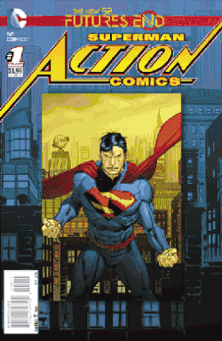 An example of "The New 52: Futures End" 3D lenticular covers, highlighting the change of image from present to future, with the cover of Action Comics: Futures End #1 (September 2014 DC Comics). Art by Lee L. Weeks.