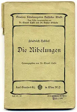 The Nibelungs (Die Nibelungen) is a German tragedy by Friedrich Hebbel in three parts, and was originally intended for performance over two evenings. The individual parts are: The Invulnerable Siegfried, Siegfried's Death and Kriemhild's Revenge. Hebbel wrote the drama between the years 1850 and 1860. The first two parts were first performed on 31 January 1861. It is one of the most noteworthy adaptations of the Nibelung material for the theater.