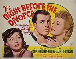 The Night Before the Divorce is a 1942 American comedy film directed by Robert Siodmak and starring Lynn Bari, Mary Beth Hughes and Joseph Allen, adapted from the 1937 play of the same name by Gina Kaus and Ladislas Fodor.[1]
