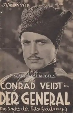 The Night of Decision (German: Die Nacht der Entscheidung) is a 1931 American German-language drama film directed by Dimitri Buchowetzki[1] and starring Conrad Veidt, Olga Chekhova, and Peter Voß.[2] Based on the 1928 play The General by Lajos Zilahy, it is also known by the alternative title of Der General. It was made at the Joinville Studios in Paris[1] as the German-language version of the Hollywood production The Virtuous Sin. It is now considered a lost film.[3][4]